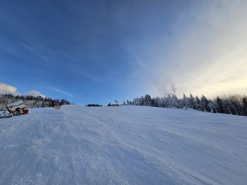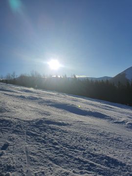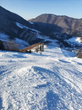 Podmienky na lyzovanie zo zaciatku fantasticke, ale od 12 tej uz dost ladova veterna aj ostiepkova. Sice cisto prirodny sneh, ale hlavne v spodnej casti ladovo tvrdo. Na mnozstvo aut na parkovisku prekvapivo temer ziadne cakacky na vleky. Mimo zjazdoviek uz skoro vsetko pojazdene, ale dali sa najst miesta s 20 cm prasanom.